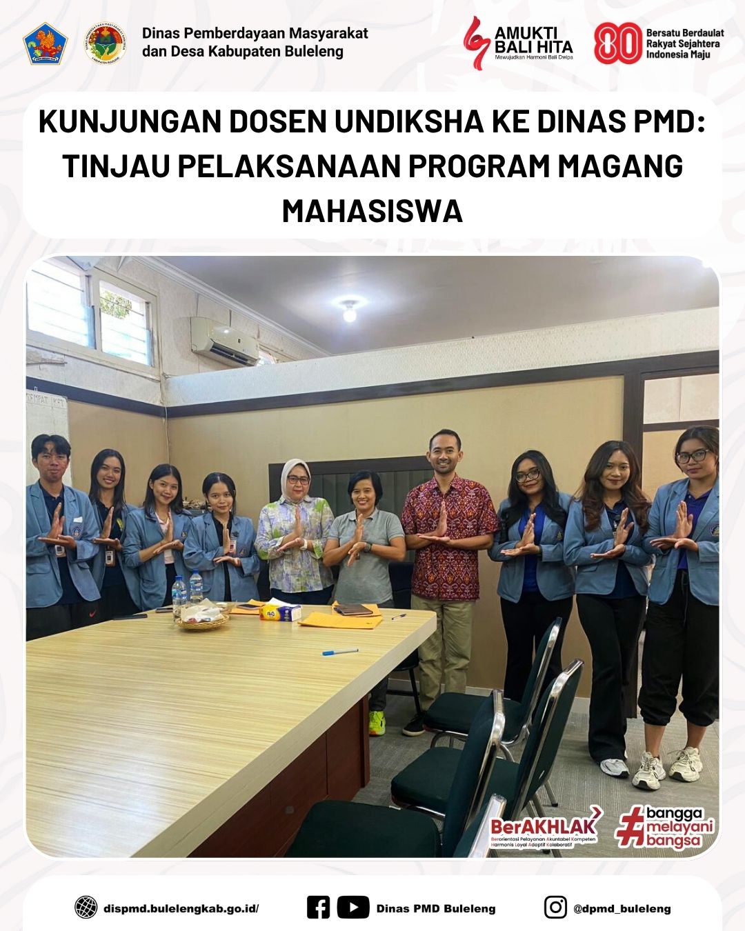 Buleleng, 6 November 2025 - Dinas Pemberdayaan Masyarakat dan Desa (PMD) Kabupaten Buleleng menerima kunjungan dari tim dosen Universitas Pendidikan Ganesha (Undiksha) dalam rangka kegiatan monitoring dan evaluasi program magang mahasiswa, Kamis (6/11). Kegiatan ini merupakan tindak lanjut dari pelaksanaan program magang yang telah berlangsung sejak 25 Agustus 2025.