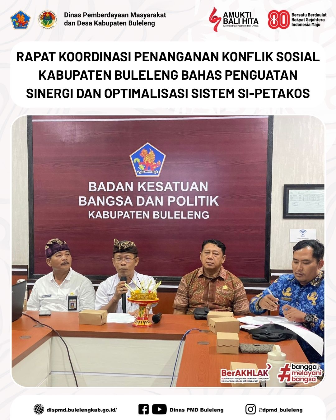 Buleleng, 28 Oktober 2025 - Dinas Pemberdayaan Masyarakat dan Desa (PMD) Kabupaten Buleleng melalui staf Bidang Penataan dan Kerja Sama Desa (PKD), Gede Andi Sukariawan, menghadiri kegiatan Rapat Koordinasi Penanganan Konflik Sosial di Daerah Kabupaten Buleleng Tahun 2025. Kegiatan ini berlangsung di Ruang Rapat Kantor Badan Kesatuan Bangsa dan Politik (Kesbangpol) Kabupaten Buleleng dan dipimpin langsung oleh Kepala Badan Kesbangpol, Nyoman Widiartha.