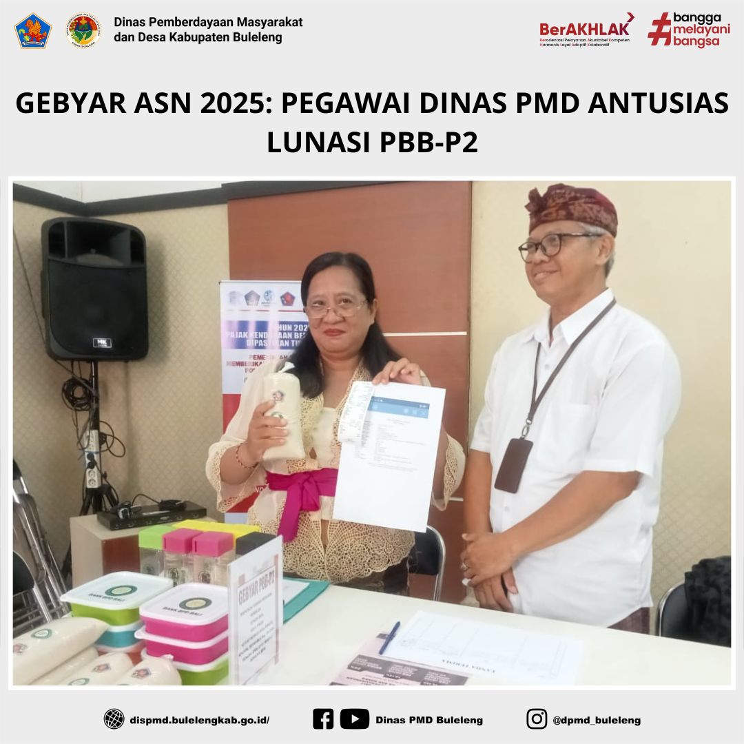 Buleleng, 12 Juni 2025 — Dalam rangka mendukung optimalisasi penerimaan daerah, Pemerintah Kabupaten Buleleng melalui Badan Pengelolaan Keuangan dan Pendapatan Daerah (BPKPD) melaksanakan kegiatan Gebyar ASN 2025, yaitu pemungutan Pajak Bumi dan Bangunan Perdesaan Perkotaan (PBB-P2) secara langsung di masing-masing perangkat daerah.