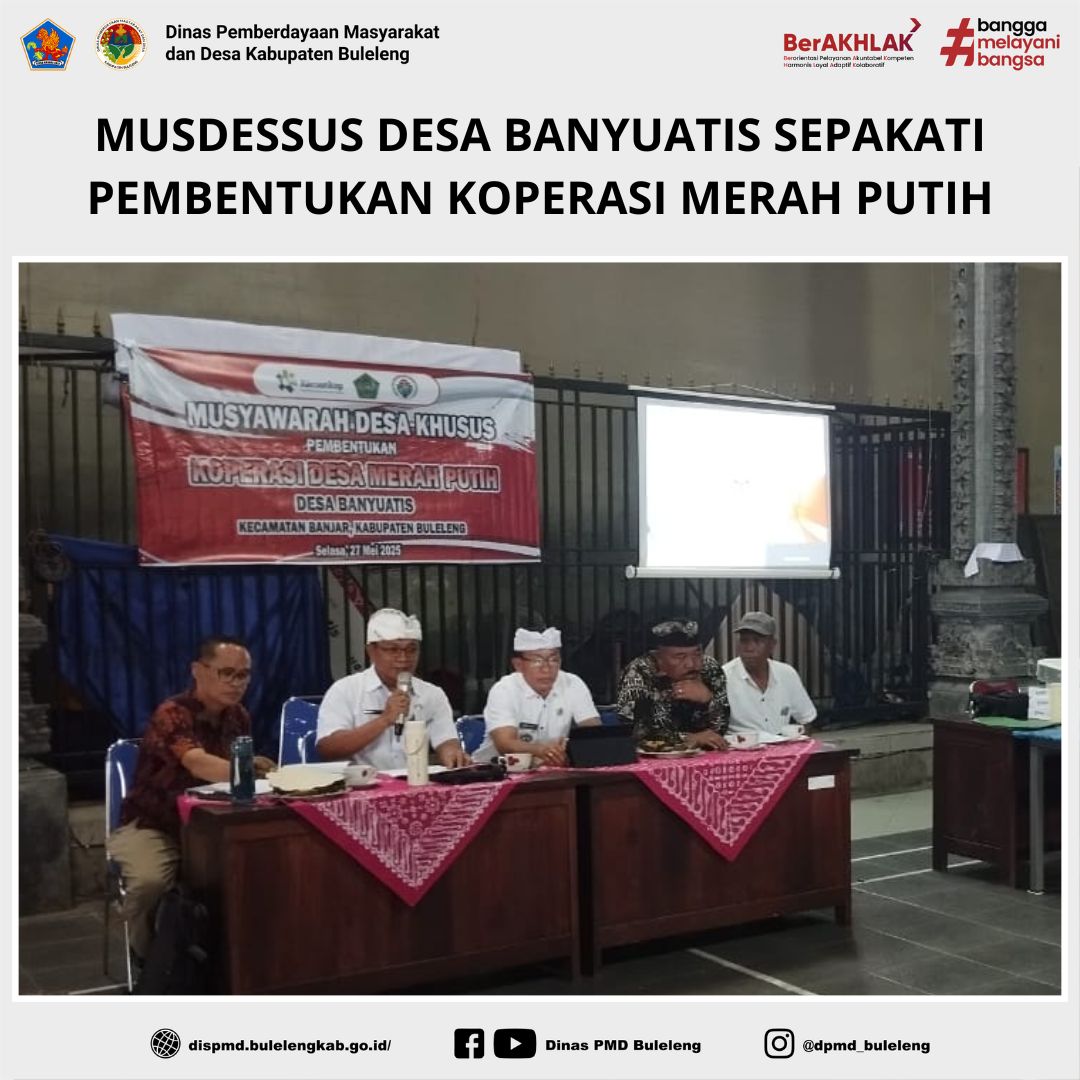 Buleleng, 27 Mei 2025 — Bertempat di Gedung Serba Guna Desa Banyuatis, Kecamatan Banjar, telah dilaksanakan Musyawarah Desa Khusus (MUSDESSUS) dalam rangka pembentukan Koperasi Merah Putih Desa Banyuatis. Kegiatan ini dihadiri oleh berbagai unsur pemerintahan dan masyarakat desa.