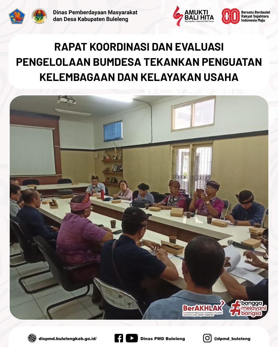Buleleng, 16 Oktober 2025 - Bidang Pemerintahan Desa pada Dinas Pemberdayaan Masyarakat dan Desa (PMD) Kabupaten Buleleng menyelenggarakan Rapat Koordinasi dan Evaluasi Pengelolaan Badan Usaha Milik Desa (BUMDesa) yang berlangsung di Ruang Rapat Dinas PMD Kabupaten Buleleng, Kamis (16/10).