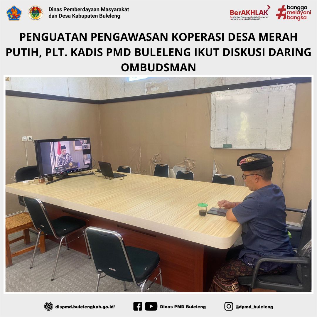 Buleleng, 12 Juni 2025 — Plt. Kepala Dinas PMD Kabupaten Buleleng, Nyoman Widiartha, hari ini mengikuti kegiatan Diskusi Tematik bertajuk "Problematika Koperasi Desa Merah Putih: Tantangan dan Dampak terhadap Pemerintahan Desa dan Keberlanjutan KUD dan BUMDes". Kegiatan yang dilaksanakan oleh OMBUDSMAN Republik Indonesia melalui Keasistenan Utama IV ini berlangsung secara daring melalui aplikasi Zoom Meeting, dengan Plt. Kadis PMD mengikuti dari Ruang Rapat Kadis PMD Kabupaten Buleleng.