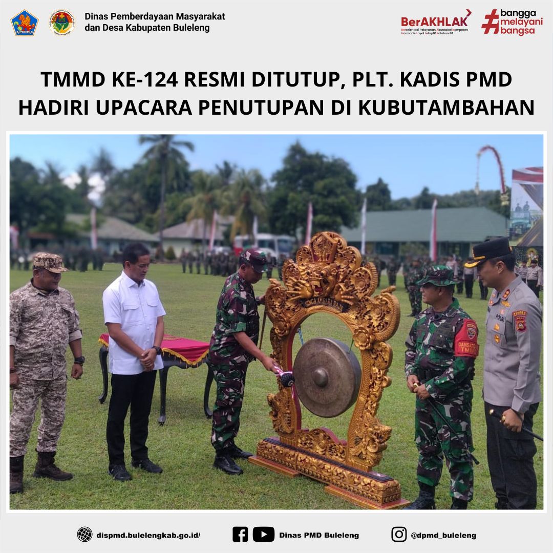 Buleleng, 4 Juni 2025 – Kegiatan TNI Manunggal Membangun Desa (TMMD) ke-124 Tahun 2025 yang diselenggarakan oleh Kodim 1609/Buleleng secara resmi ditutup melalui sebuah upacara yang berlangsung di Lapangan Kompi Senapan B dan C Yonif 900/SBW, Desa Kubutambahan, Kecamatan Kubutambahan. Upacara yang mengusung tema “Dengan Semangat TMMD Mewujudkan Pemerataan Pembangunan dan Ketahanan Nasional di Wilayah” tersebut dihadiri oleh sejumlah pejabat TNI, pemerintah daerah, dan tokoh masyarakat.