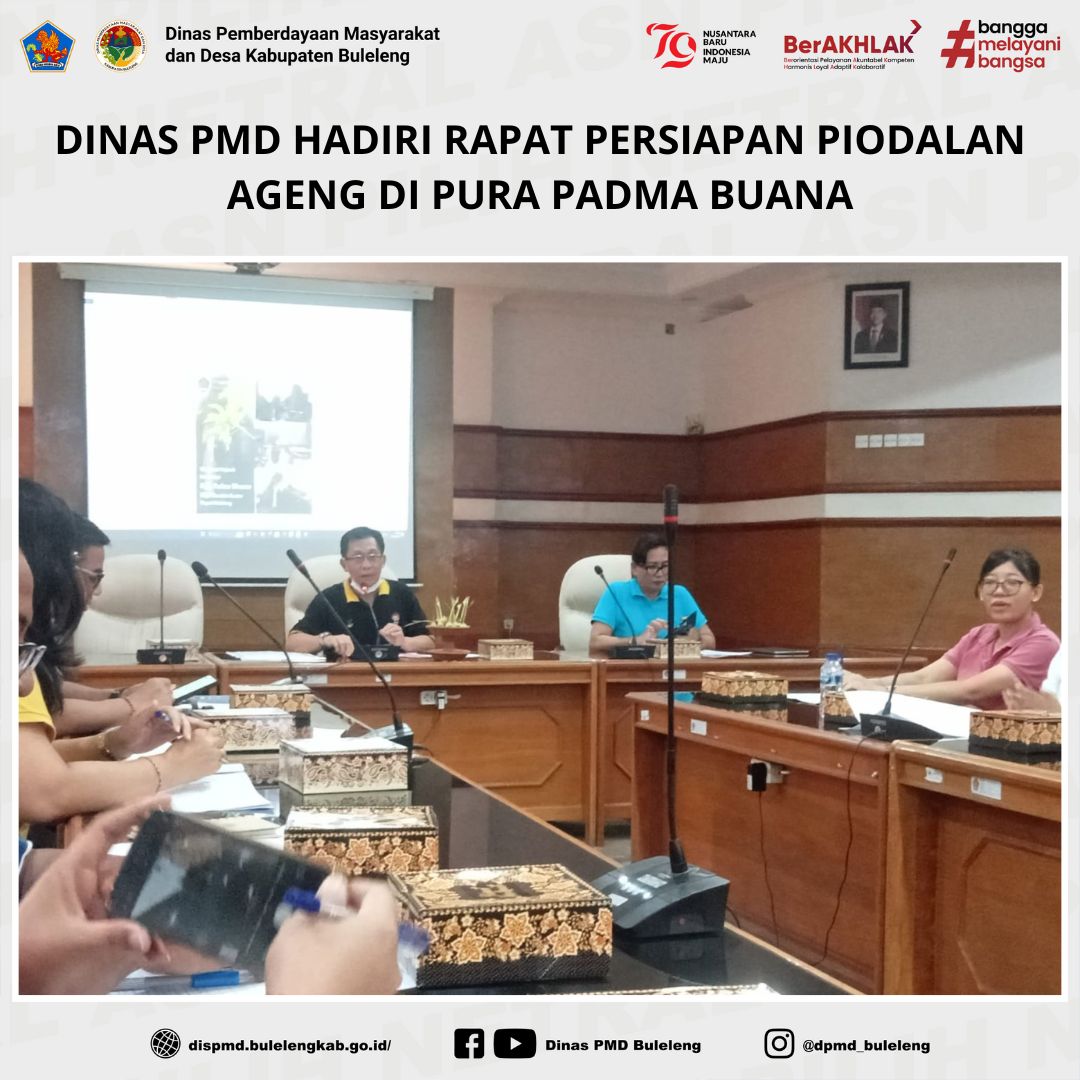 Buleleng, 20 Desember 2024 - Dinas Pemberdayaan Masyarakat dan Desa (PMD) Kabupaten Buleleng, yang diwakili oleh Sekretaris Dinas (Sekdis), Gede Sasnita Ariawan, S.H., M.H., didampingi Kasubbag Umum, Made Desi Widiarsini, S.E., mengikuti rapat persiapan Piodalan Ageng di Pura Padma Buana, Kantor Bupati Buleleng. Rapat tersebut dipimpin oleh Asisten I Setda Kabupaten Buleleng, I Gede Sandhiyasa, S.Sos., M.Si., bertempat di Ruang Rapat Unit IV Setda Kabupaten Buleleng.