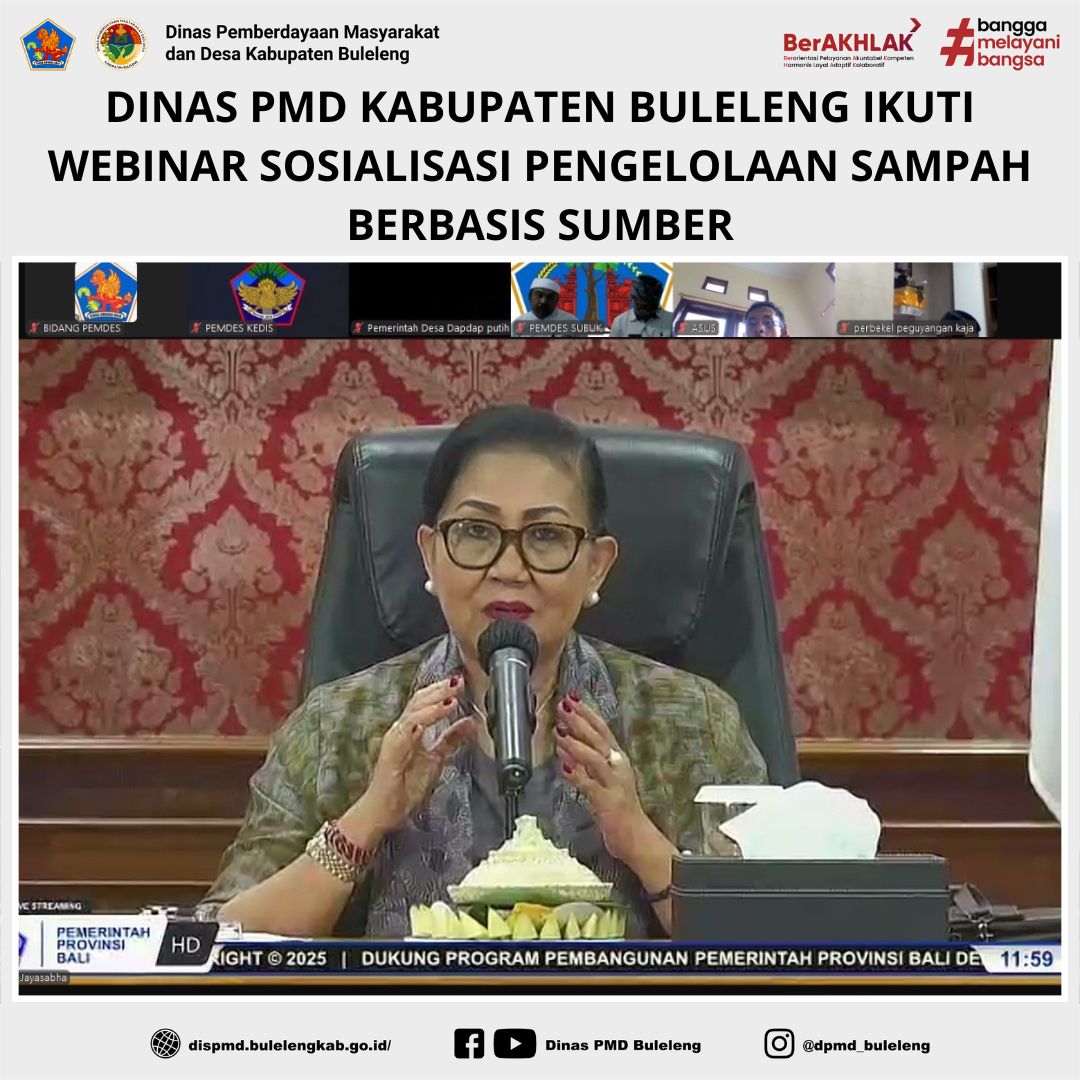Buleleng, 28 Mei 2025 – Dinas Pemberdayaan Masyarakat dan Desa (PMD) Kabupaten Buleleng melalui Bidang Pemerintahan Desa mengikuti kegiatan Webinar Sosialisasi Pengelolaan Sampah Berbasis Sumber yang diselenggarakan oleh Dinas PMDDUKCAPIL Provinsi Bali. Kegiatan yang dilaksanakan secara daring melalui Zoom ini dibuka secara resmi oleh Kepala Dinas Kehutanan dan Lingkungan Hidup Provinsi Bali.