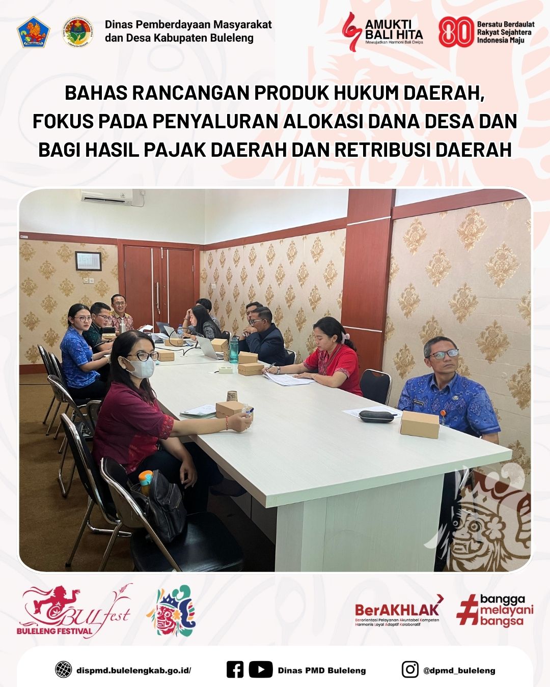 Buleleng, 12 Agustus 2025 - Dinas Pemberdayaan Masyarakat dan Desa (PMD) Kabupaten Buleleng melalui Bidang Pemerintahan Desa menghadiri rapat pembahasan dua Rancangan Produk Hukum Daerah Kabupaten Buleleng terkait Tata Cara Penyaluran Alokasi Dana Desa serta Bagian dari Hasil Pajak Daerah dan Retribusi Daerah untuk tahun 2025-2026. Kegiatan berlangsung di Ruang Rapat Sekretariat Daerah Kabupaten Buleleng, Selasa (12/8).