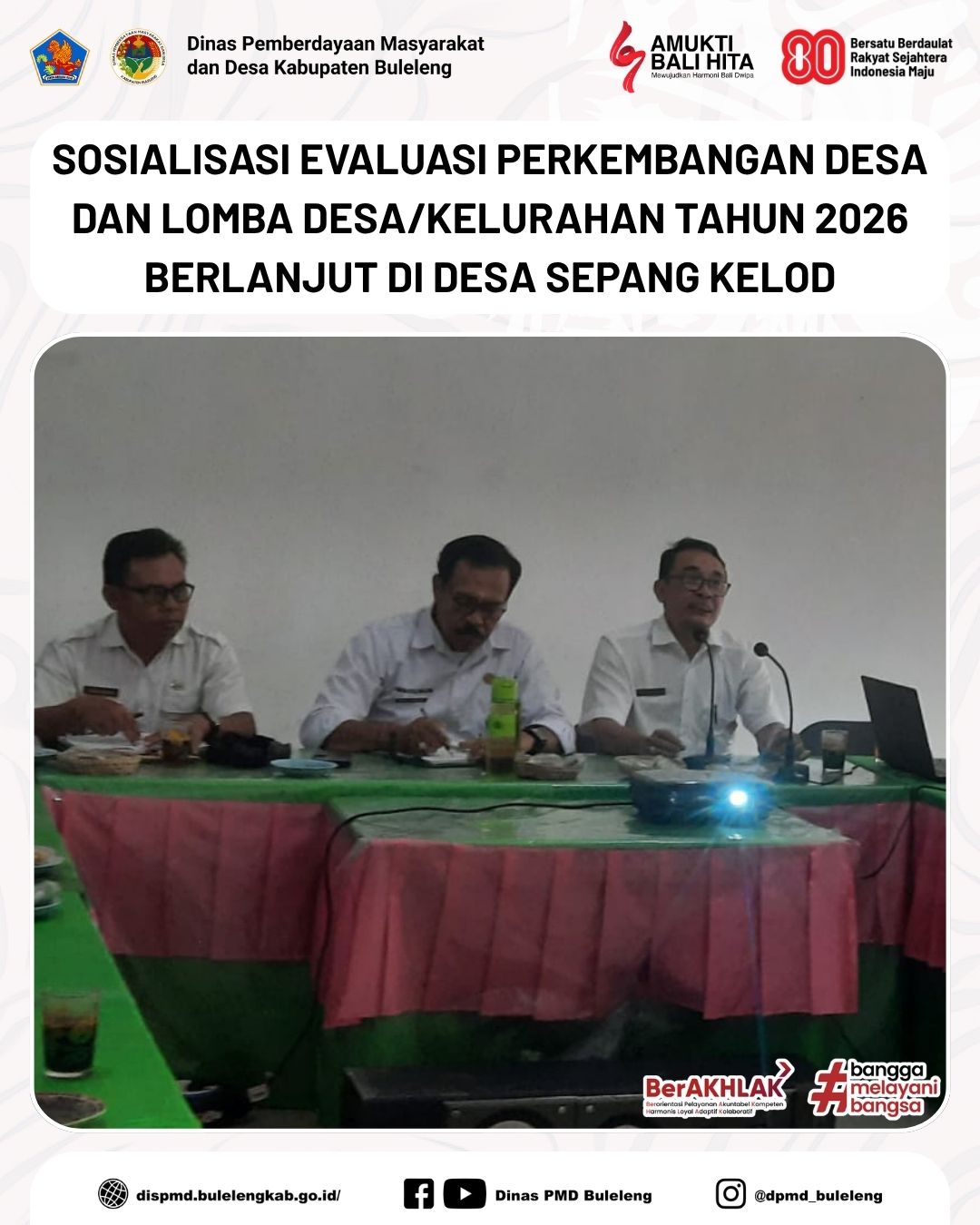 Buleleng, 22 Oktober 2025 - Dinas Pemberdayaan Masyarakat dan Desa (PMD) Kabupaten Buleleng melalui Bidang Pemerintahan Desa kembali melaksanakan kegiatan Sosialisasi Evaluasi Perkembangan Desa dan Perlombaan Desa/Kelurahan Tingkat Kabupaten Buleleng Tahun 2026, pada Rabu (22/10), bertempat di Aula Kantor Desa Sepang Kelod, Kecamatan Busungbiu.