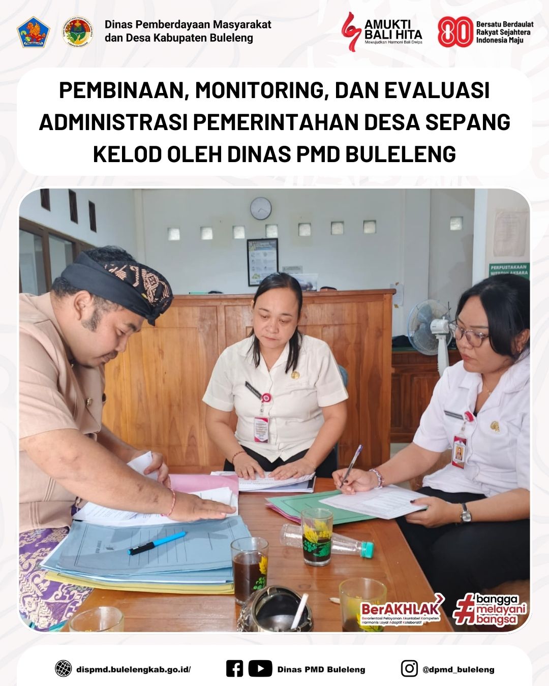Buleleng, 27 Agustus 2025 - Dinas Pemberdayaan Masyarakat dan Desa (PMD) Kabupaten Buleleng melalui Bidang Pemerintahan Desa (Pemdes) melaksanakan kegiatan Pembinaan, Monitoring, dan Evaluasi Pelaksanaan Administrasi Pemerintahan Desa Tahun 2025 di Desa Sepang Kelod, Kecamatan Busungbiu.