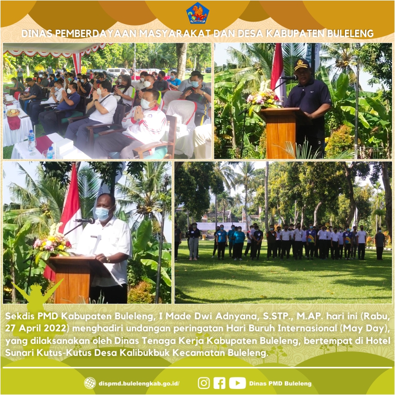 Sekdis PMD Kabupaten Buleleng, I Made Dwi Adnyana, S.STP., M.AP. hari ini (Rabu, 27 April 2022) menghadiri undangan peringatan Hari Buruh Internasional (May Day), yang dilaksanakan oleh Dinas Tenaga Kerja Kabupaten Buleleng, bertempat di Hotel Sunari Kutus-Kutus Desa Kalibukbuk Kecamatan Buleleng. Kegiatan dihadiri oleh Bpk. Asisten Administrasi Umum mewakili Bpk. Bupati Buleleng, Asisten Pemerintahan dan Kesra, Beberapa OPD terkait, BPJS Kesehatan, BPJS Ketenagakerjaan, SPSI, Asosiasi Pengusaha Indonesia, PHRI dan undangan lainnya.