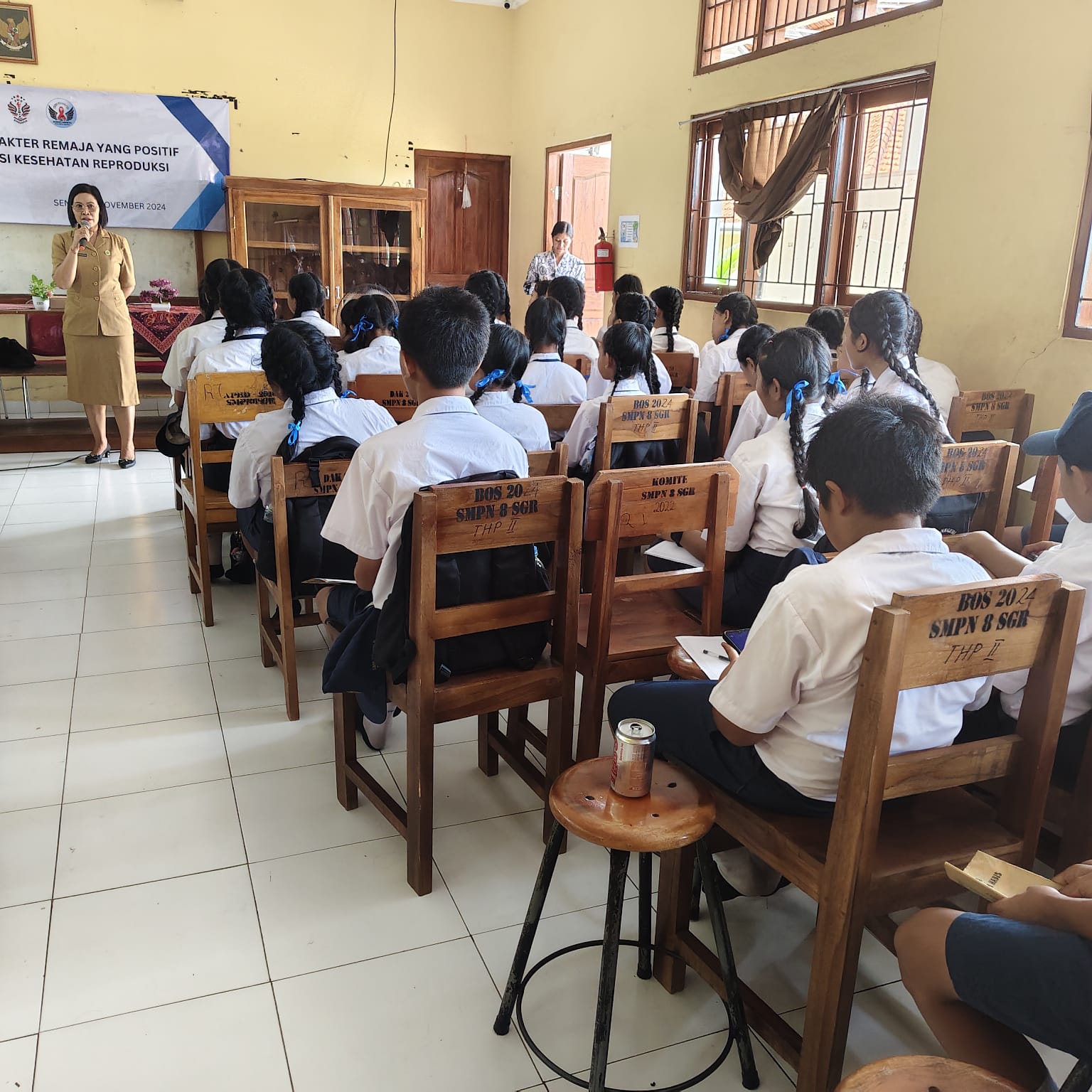 Bid. Keluarga Berencana Ketahanan dan Kesejahteraan Keluarga Dinas P2KBP3A Kabupaten Buleleng Bdn. NYOMAN MANDAYANI, SST.Keb , M.A.P selaku Narasumber Membangun Karakter Remaja yang Positif Melalui Edukasi Kesehatan Reproduksi yang dilaksanakan di SMP Negeri 8 Singaraja.