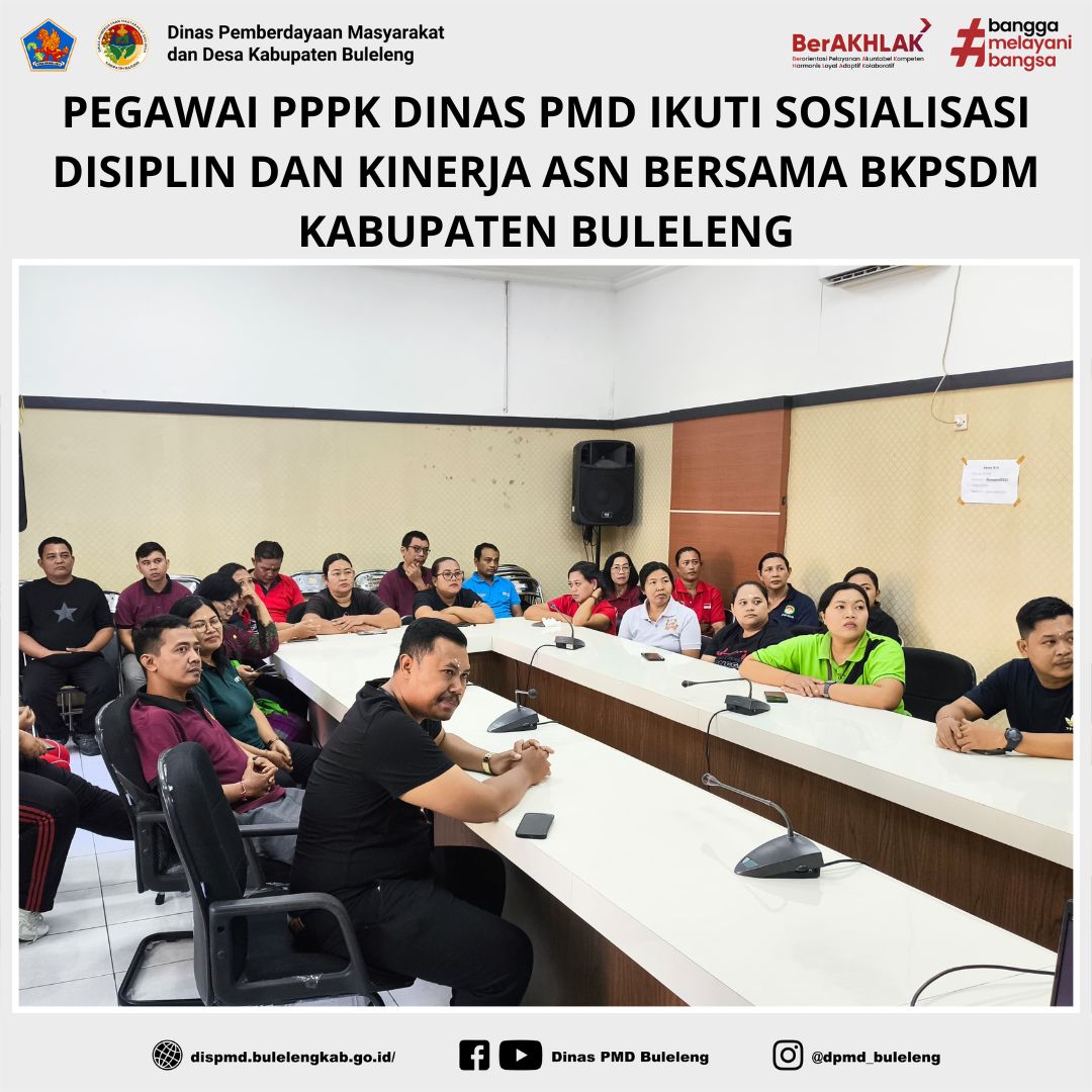 Buleleng, 24 Juli 2025 - Dalam rangka meningkatkan pemahaman dan kompetensi pegawai Pemerintah dengan Perjanjian Kerja (PPPK) terkait disiplin serta pengelolaan kinerja, Badan Kepegawaian dan Pengembangan Sumber Daya Manusia (BKPSDM) Kabupaten Buleleng menyelenggarakan kegiatan sosialisasi secara daring melalui Zoom Meeting. Pegawai PPPK di lingkungan Dinas Pemberdayaan Masyarakat dan Desa (PMD) Kabupaten Buleleng turut hadir mengikuti kegiatan ini dari Ruang Rapat Dinas PMD.