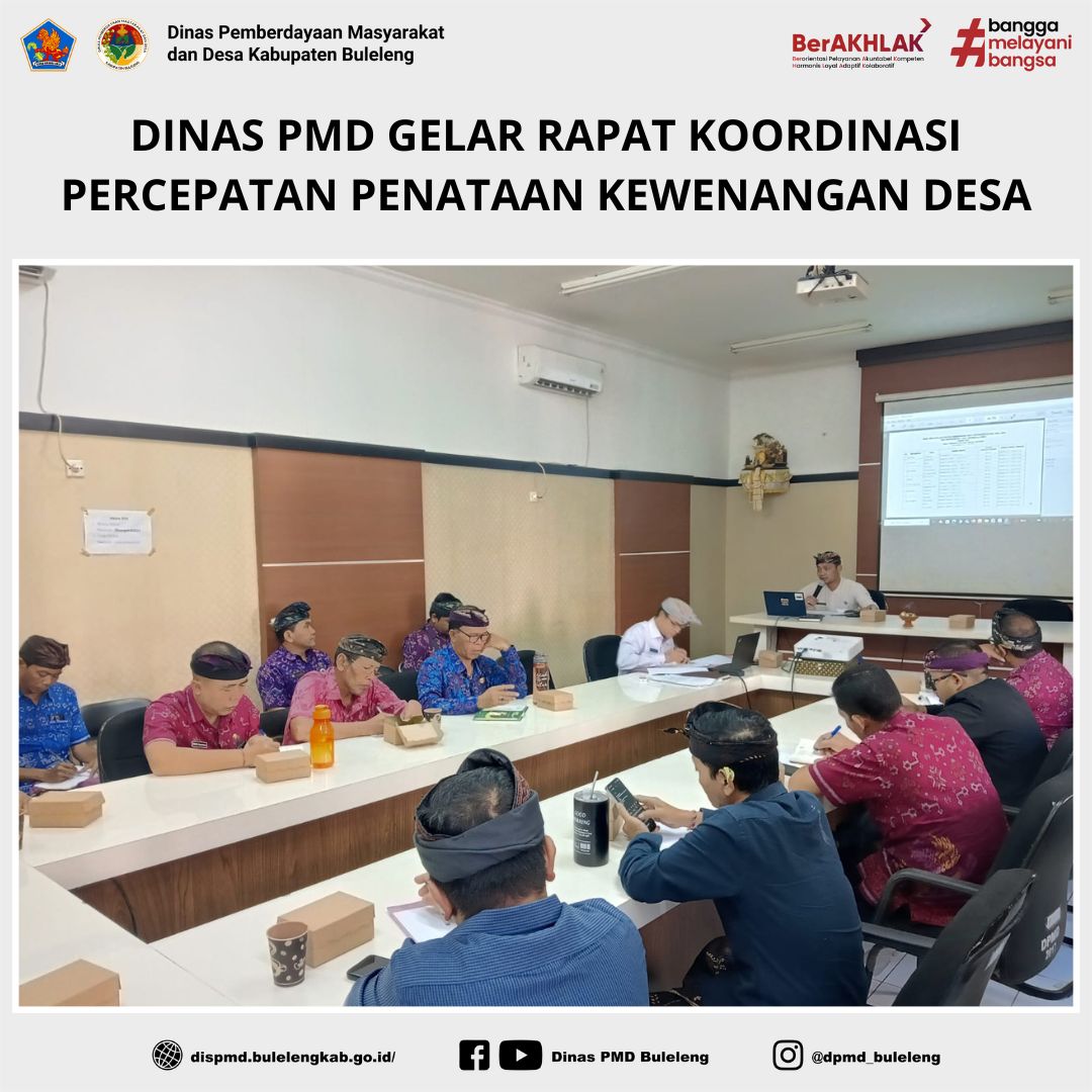 Buleleng, 31 Juli 2025 - Dalam upaya mendorong percepatan pembaruan regulasi di tingkat desa, Dinas Pemberdayaan Masyarakat dan Desa (PMD) Kabupaten Buleleng melalui Bidang Penataan dan Kerjasama Desa (PKD) menyelenggarakan Rapat Koordinasi Percepatan Penataan Kewenangan Desa. Kegiatan ini berlangsung pada Kamis, 31 Juli 2025, bertempat di ruang rapat Dinas PMD Kabupaten Buleleng.