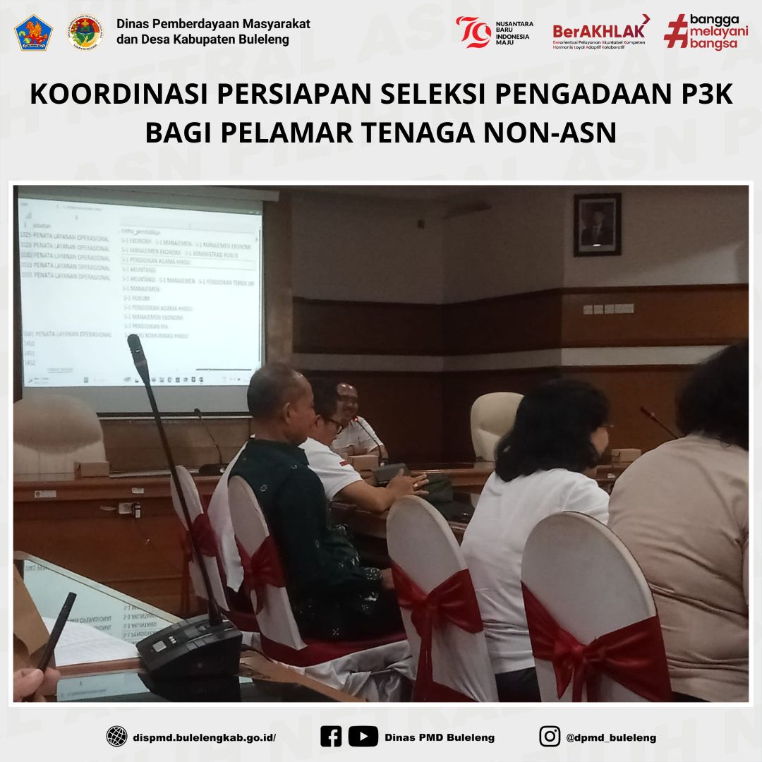 Buleleng, 15 November 2024 - Sekretaris Dinas PMD Kabupaten Buleleng, Gede Sasnita Ariawan, S.H., M.H., didampingi oleh Kasubbag Umum, Made Desi Widiarsini, S.E., mengikuti rapat koordinasi persiapan seleksi pengadaan Pegawai Pemerintah dengan Perjanjian Kerja (P3K) bagi pelamar tenaga non-ASN yang aktif bekerja. Rapat tersebut dipimpin oleh Sekretaris Daerah Kabupaten Buleleng, Gede Suyasa, dan dilaksanakan pada hari Jumat, 15 November 2024, di Ruang Rapat Unit IV Setda Kabupaten Buleleng.