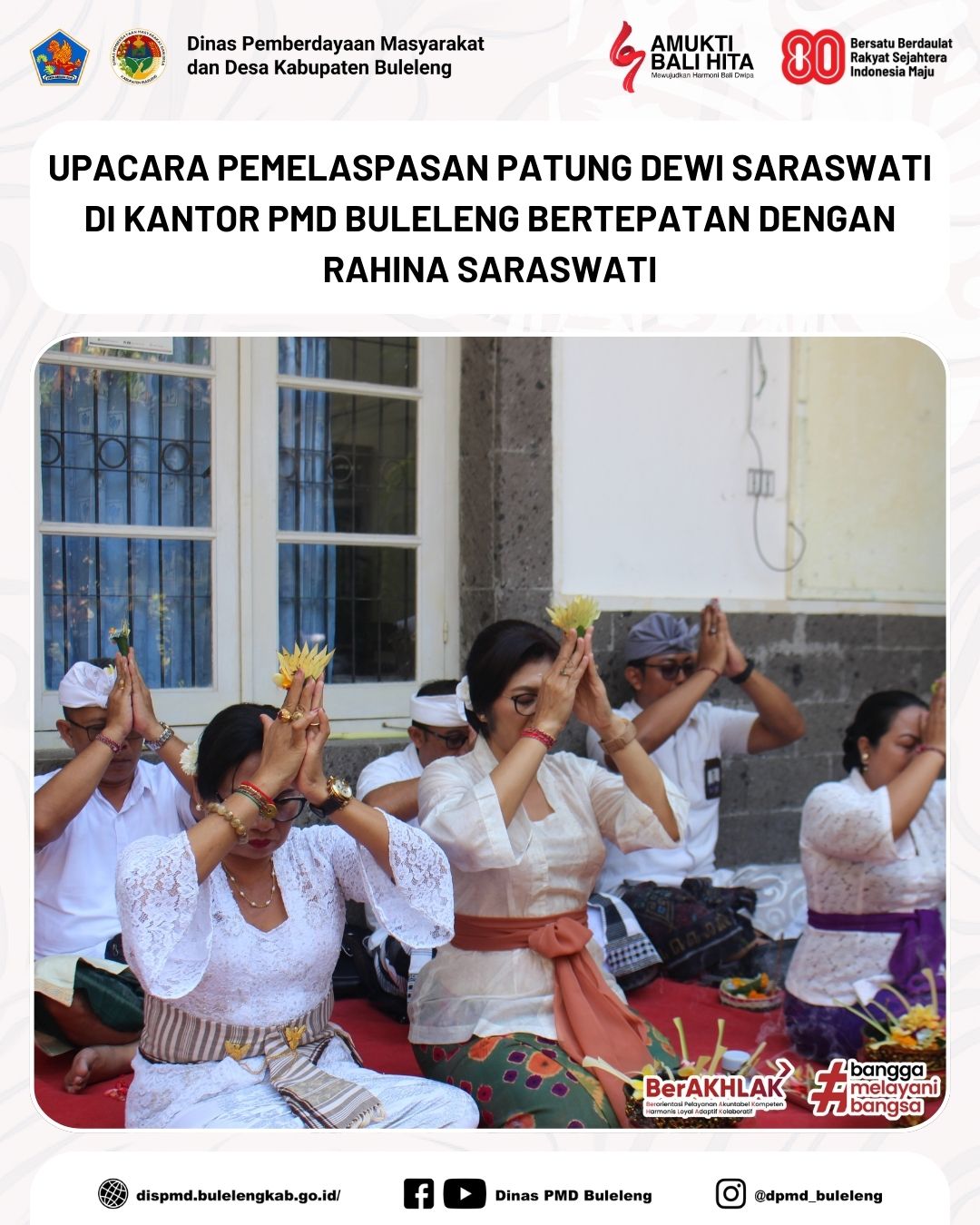 Buleleng, 6 September 2025 - Dinas Pemberdayaan Masyarakat dan Desa (PMD) Kabupaten Buleleng melaksanakan upacara pemelaspasan patung Dewi Saraswati yang bertempat di halaman kantor, Sabtu (6/9). Upacara ini bertepatan dengan Rahina Saraswati, Saniscara Umanis Watugunung.