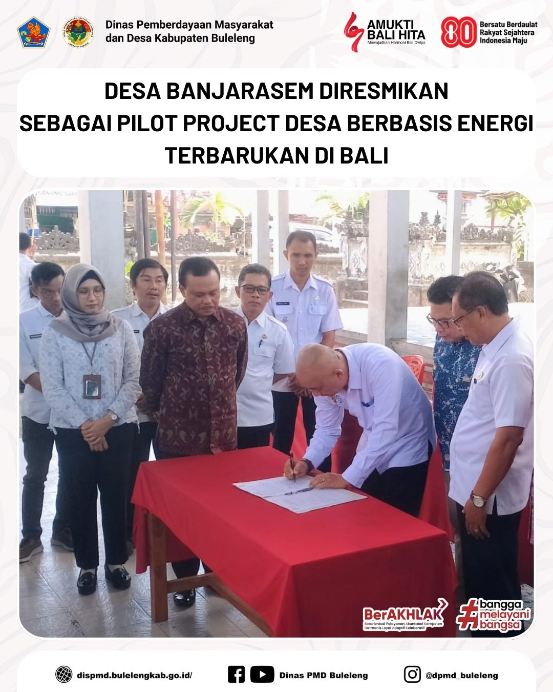 Buleleng, 27 Agustus 2025 - Desa Banjarasem, Kecamatan Seririt, Kabupaten Buleleng resmi menjadi salah satu lokasi pilot project Desa Berbasis Energi Terbarukan (DBET) di Bali. Peresmian berlangsung di Balai Desa Kantor Perbekel Banjarasem, Rabu (27/8), ditandai dengan seremonial peluncuran Pembangkit Listrik Tenaga Surya (PLTS) untuk mendukung fasilitas umum desa.