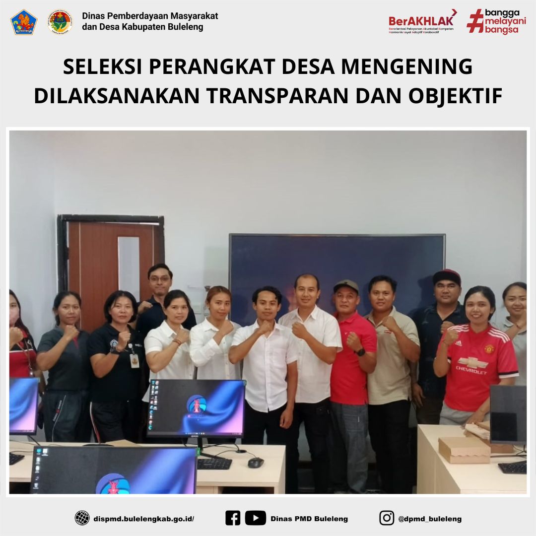 Kegiatan seleksi dihadiri oleh Kasi Pemerintahan Kecamatan Kubutambahan, staf penguji dari Kominfosanti Kabupaten Buleleng, Ketua BPD Desa Mengening, perangkat Desa Mengening, serta panitia penjaringan dan penyaringan perangkat desa.
