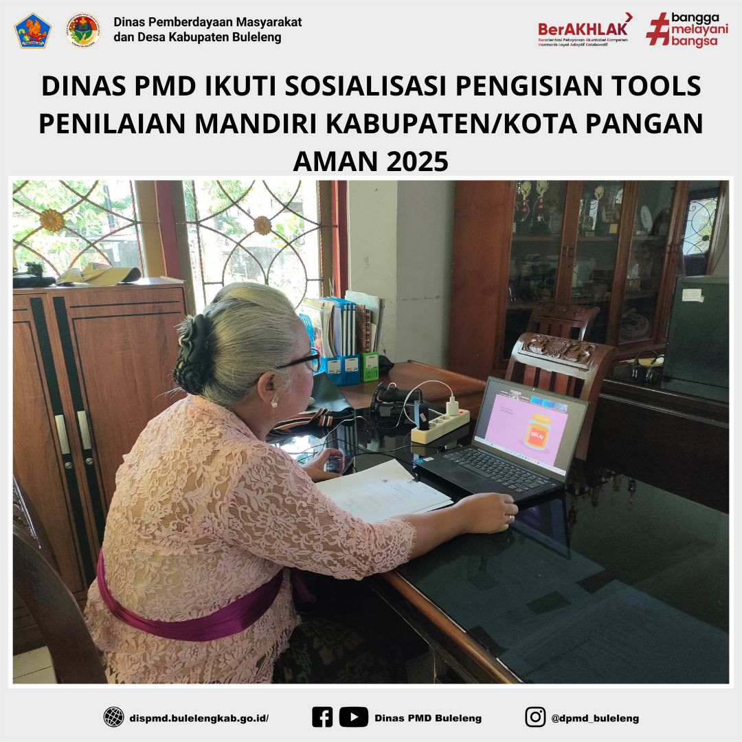 Buleleng, 22 Mei 2025 — Dinas Pemberdayaan Masyarakat dan Desa (PMD) Kabupaten Buleleng, yang diwakili oleh Fungsional Penggerak Swadaya Masyarakat (PSM), Ni Putu Yasmini, turut menghadiri kegiatan Sosialisasi Teknis Pengisian Tools Penilaian Mandiri Kabupaten/Kota Pangan Aman Tahun 2025 yang diselenggarakan oleh Badan Pengawas Obat dan Makanan (Badan POM) RI secara daring melalui Zoom Meeting.