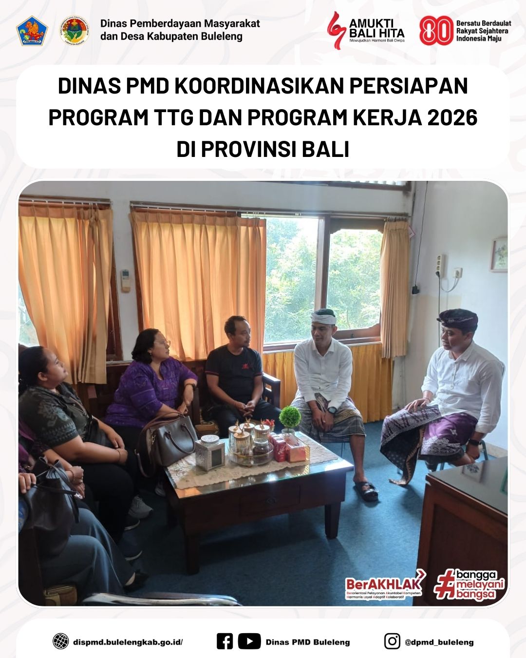 Denpasar, 19 Desember 2025 - Dalam rangka koordinasi pelaksanaan Lomba Teknologi Tepat Guna (TTG) Tingkat Nasional serta penyelarasan Program Kerja Tahun 2026, Dinas PMD Kabupaten Buleleng melalui Bidang Lembaga Kemasyarakatan Desa, Adat, dan Usaha Ekonomi Masyarakat (LKDA-UEM) melaksanakan kegiatan koordinasi ke Dinas PMD Dukcapil Provinsi Bali pada Jumat (19/12). Kegiatan ini dipimpin oleh Kepala Bidang LKDA-UEM Ni Made Banu Deviati dan diterima langsung oleh Fungsional Penggerak Swadaya Masyarakat (PSM) Provinsi Bali, I Wayan Dharma Susila.