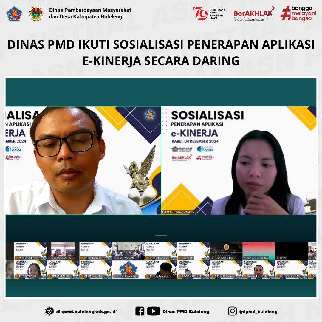 Buleleng, 4 Desember 2024 – Kasubbag Umum Dinas Pemberdayaan Masyarakat dan Desa (Dinas PMD) Kabupaten Buleleng, Made Desi Widiarsini, S.E., bersama staf, turut serta dalam kegiatan Sosialisasi Penerapan Aplikasi e-Kinerja yang dilaksanakan oleh Badan Kepegawaian dan Pengembangan Sumber Daya Manusia (BKPSDM) Kabupaten Buleleng, Rabu (4/12). Kegiatan ini dilaksanakan secara daring melalui Zoom Meeting dan diikuti oleh berbagai Organisasi Perangkat Daerah (OPD) di lingkungan Pemkab Buleleng.