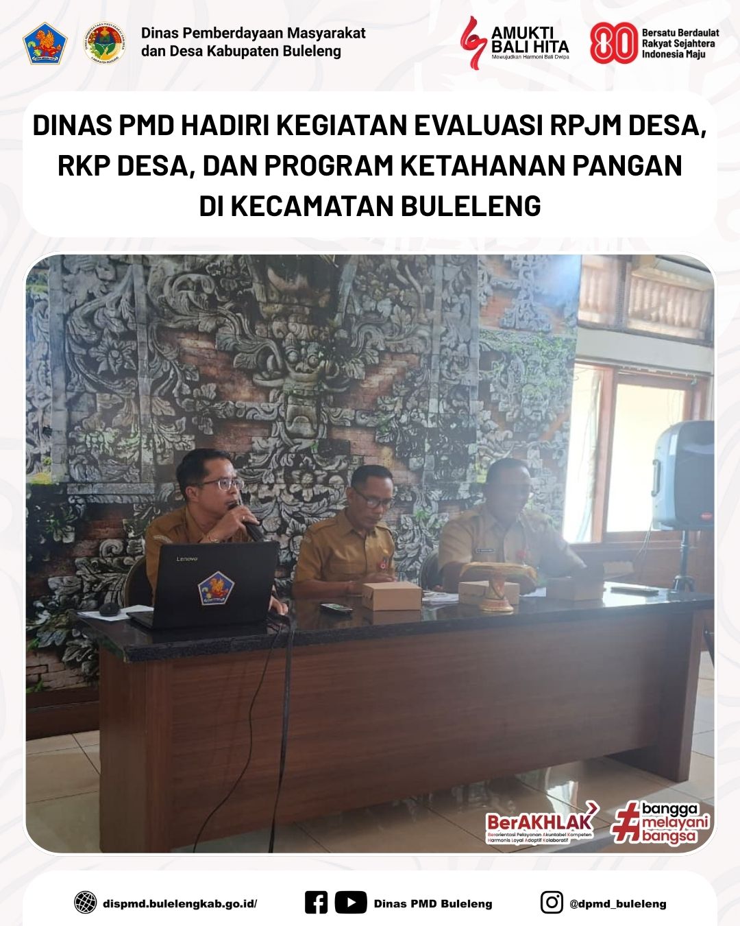 Buleleng, 20 Oktober 2025 - Dinas Pemberdayaan Masyarakat dan Desa (PMD) Kabupaten Buleleng melalui Bidang Pemerintahan Desa menghadiri kegiatan Evaluasi RPJM Desa dan RKP Desa serta Program Ketahanan Pangan Tahun 2025 yang diselenggarakan di Kantor Camat Buleleng pada Senin (20/10).