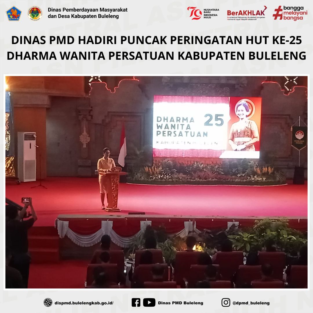 Buleleng, 10 Desember 2024 - Dinas Pemberdayaan Masyarakat dan Desa (PMD) Kabupaten Buleleng menghadiri puncak peringatan HUT ke-25 Dharma Wanita Persatuan (DWP) Tahun 2024 yang berlangsung pada Selasa, 10 Desember 2024, di Gedung Kesenian Gde Manik, Singaraja. Dalam kesempatan tersebut, Dinas PMD diwakili oleh Kasubbag Umum, Made Desi Widiarsini, S.E.