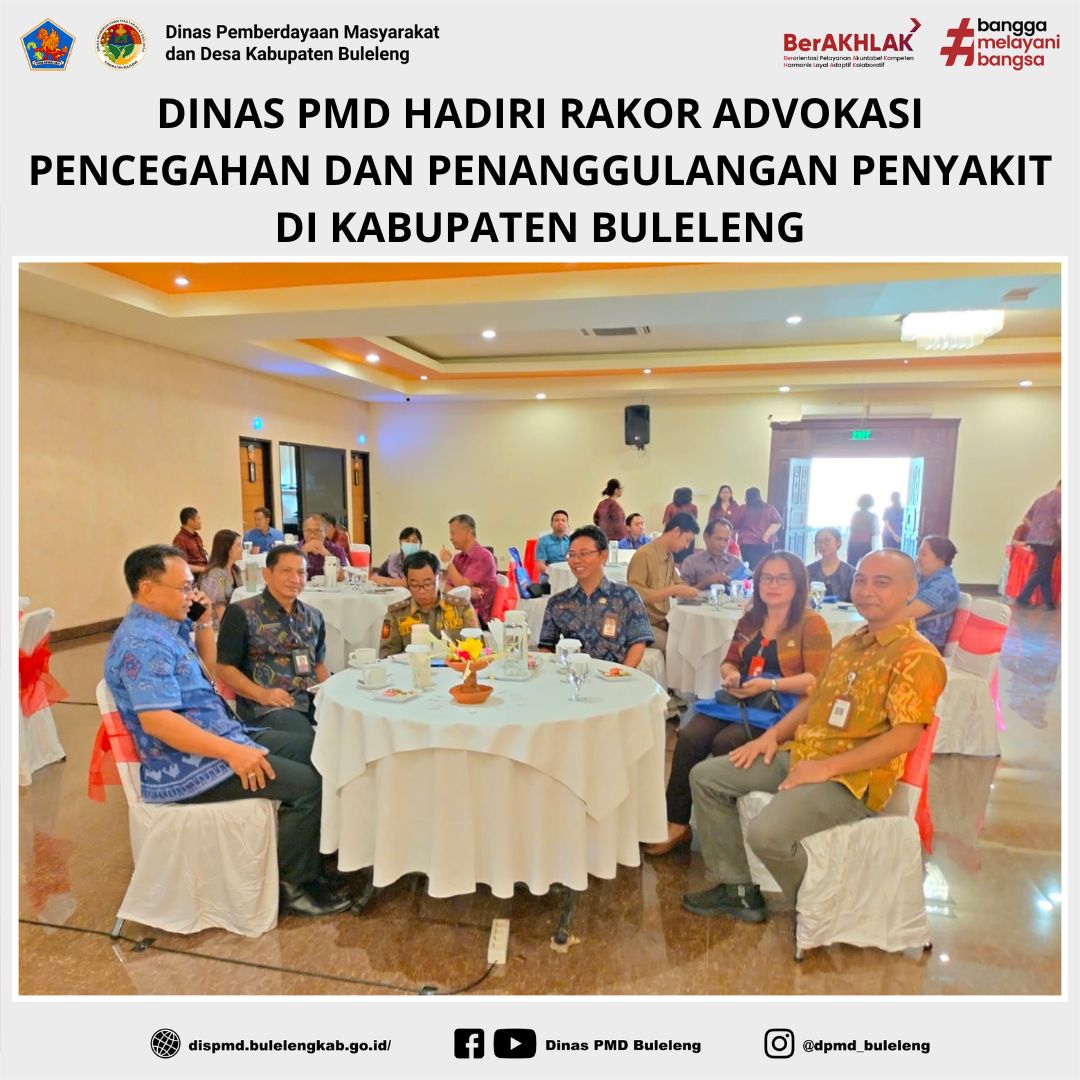 Buleleng, 29 Juli 2025 - Dinas Pemberdayaan Masyarakat dan Desa (PMD) Kabupaten Buleleng yang diwakili oleh Fungsional Penggerak Swadaya Masyarakat (PSM), Dewa Nyoman Suarjana Putra, menghadiri Rapat Koordinasi Advokasi Pencegahan dan Penanggulangan Penyakit Kabupaten Buleleng Tahun 2025. Kegiatan ini diselenggarakan oleh Dinas Kesehatan Kabupaten Buleleng dan bertempat di Banyualit Spa'n Resort, Lovina.