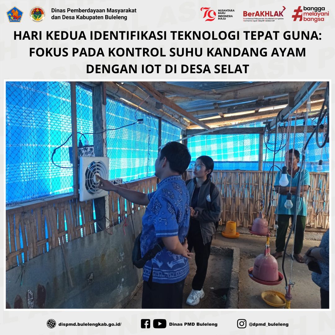 Inventor yang didatangi pada kesempatan ini adalah I Ketut Suprapta, yang berasal dari Banjar Dinas Gambuh, Desa Selat. Teknologi ini berfokus pada Kontrol Suhu dan Kelembaban Kandang Ayam menggunakan sistem IoT, yang memungkinkan pengaturan suhu dan kelembaban kandang ayam secara otomatis guna meningkatkan kenyamanan dan produktivitas ternak.