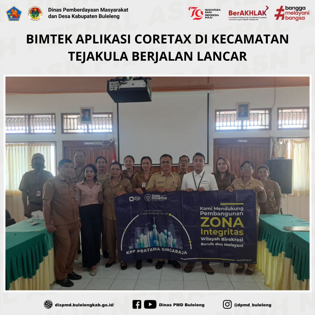 Buleleng, 10 Maret 2025 – Dinas Pemberdayaan Masyarakat dan Desa (PMD) Kabupaten Buleleng melalui perwakilan dari Bidang Pemerintahan Desa, Kadek Sadnyana, S.Sos., mendampingi pelaksanaan Bimbingan Teknis (Bimtek) terkait penggunaan Aplikasi CORETAX di Kecamatan Tejakula. Kegiatan ini berlangsung di Ruang Rapat Kantor Camat Tejakula dan diikuti oleh Bendahara Desa dari 10 desa di kecamatan tersebut.