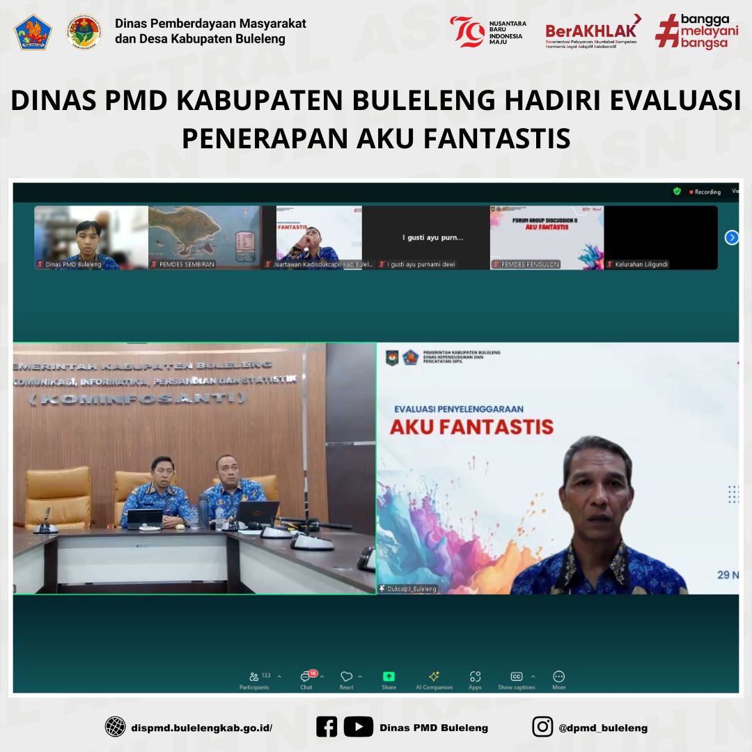 Buleleng, 29 November 2024 - Dinas Kependudukan dan Pencatatan Sipil (Disdukcapil) Kabupaten Buleleng menggelar pertemuan daring pada Jumat, 29 November 2024, untuk mengevaluasi penerapan program AKU Fantastis (Administrasi Kependudukan Difasilitasi Desa/Kelurahan Terintegrasi Tuntas Sejam dan Gratis). Acara ini turut dihadiri oleh perwakilan Dinas Pemberdayaan Masyarakat dan Desa (PMD) Kabupaten Buleleng, yang diwakili oleh staf Sub Bagian Umum, I Kd. Hendra Yudhapratama.