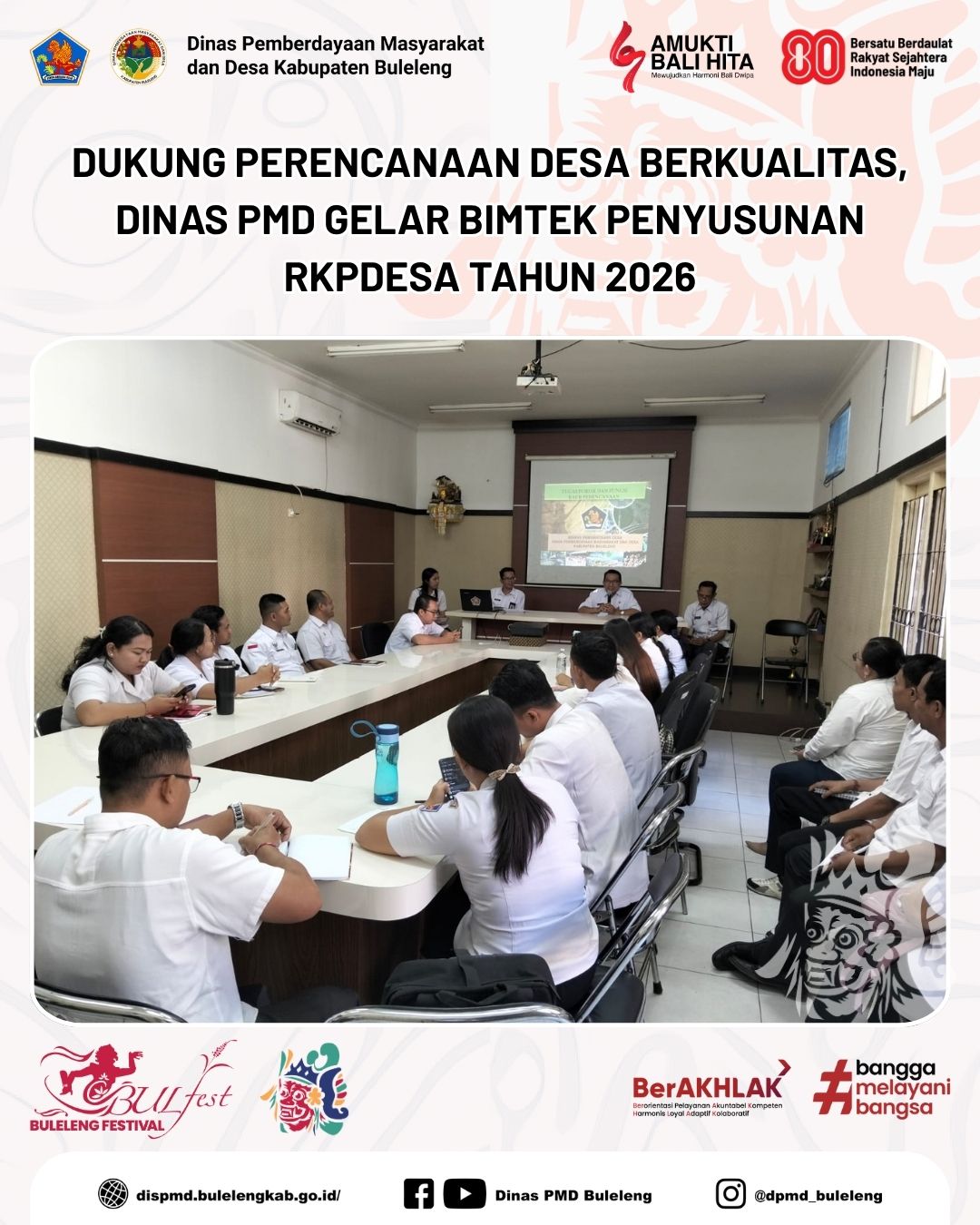 Buleleng, 6 Agustus 2025 - Dalam rangka meningkatkan kapasitas aparatur desa dalam perencanaan pembangunan, Dinas Pemberdayaan Masyarakat dan Desa (PMD) Kabupaten Buleleng melalui Bidang Pemerintahan Desa menyelenggarakan Bimbingan Teknis (Bimtek) Penyusunan Rencana Kerja Pemerintah Desa (RKPDesa) Tahun 2026. Kegiatan ini dilaksanakan di Ruang Rapat Dinas PMD dan diikuti oleh 25 Kaur Perencanaan dari 9 kecamatan se-Kabupaten Buleleng.