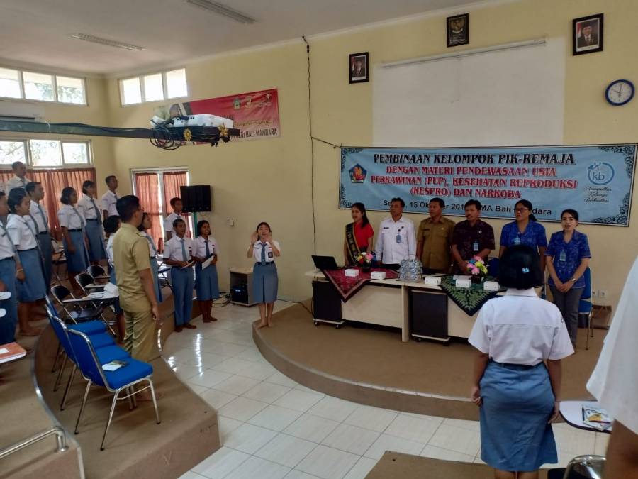 Pembinaan Kelompok PIK Remaja yang dilaksanakan di SMA Bali Mandara yang diselenggarakan pada hari Selasa, 15 Oktober 2019 denagn materi pendewasaan usia operkawinan (PUP), kesehatan reproduksi dan narkoba