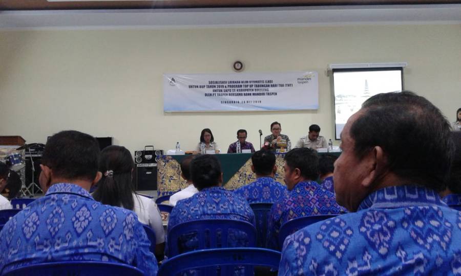 Sosialisasi layanan klim otomatis untuk BUP tahun 2019 dan program top UP tabungan hari tua untuk SKPD se- kabupaten buleleng oleh PT taspen bersama bank mandiri taspen. Tabungan dengan jaminan keuangan di masa pensiun dengan nyaman, sejahtera, untuk menikmati hari-hari yang indah. TUJUAN Meningkatkan kesejahteraan pegawai negeri sipil (PNS) dan keluarganya dengan memberikan jaminan keuangan pada waktu mencapai usia pensiun atau bagi ahli warisnya (suami/isteri/anak/orang tua) pada waktu peserta meninggal dunia sebelum usia pensiun. PESERTA PNS ( tidak termasuk PNS di lingkungan Departemen Hankam) Pejabat Negara Pegawai BUMN / BUMD yang terdaftar MASA KEPESERTAAN Sejak diangkat sebagai calon pegawai/pegawai tetap/pejabat Negara. Menyampaikan laporan perubahan data peserta dan keluarga Program Tabungan Hari Tua Adalah suatu program asuransi yang memberikan jaminan keuangan bagi peserta,berupa pembayaran sekaligus kepada peserta pada waktu mencapai usia pensiun atau kepada ahli warisnya pada waktu peserta meninggal dunia sebelum mencapai usia pensiun. Bagi peserta yang berhenti bekerja sebelum mencapai usia pensiun atau bukan karena meninggal dunia , akan memperoleh pembayaran sekaligus dalam bentuk Nilai Tunai. Disamping itu peserta Program Asuransi Dwiguna juga akan memperoleh Asuransi Kematian tanpa harus menambah iuran. Program Asuransi Kematian adalah asuransi seumur hidup bagi peserta dan istri/suami, serta meruapakan asuransi berjangka bagi anak peserta yang belum mencapai usia 21 s.d 25 tahun bagi yang belum menikah dan masih sekolah/kuliah. Peserta Program Tabungan Hari Tua a. Pegawai Negeri Sipil kecuali Pegawai Negeri Sipil Departemen HANKAM b. Pejabat Negara c. Pegawai BUMN/BUMD Hak-hak Peserta Program THT: 1. Manfaat THT dibayarkan apabila peserta berhenti sebagai Pegawai Negeri Sipil karena pensiun atau meninggal dunia 2. Manfaat Nilai Tunai dibayarkan apabila peserta berhenti/keluar bukan karena pensiun atau meninggal dunia. 3. Manfaat Asuransi Kematian dibayarkan apabila peserta, suami/istri dan anak peserta meninggal dunia.