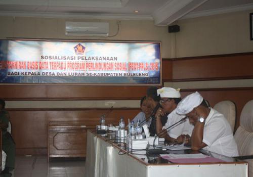 Salah satu kendala dalam penerapan program penanggulangan kemiskinan adalah ketid akakuratan data. Data yang tidak akurat mengakibatkan pelaksanaan program tidak tepat sasaran, sehingga program-program penanggulangan kemiskinan yang digelontorkan ke desa tidak mampu mencapai hasil yang maksimal. Oleh karena itu dalam upaya mewujudkan ketersediaan data dalam pelaksanaan program penanggulangan kemiskinan pemerintah melaksanakan Pemutakhiran Basis Data Terpadu Program Perlindungan Sosial Tahun 2015. Salah satunya dengan cara mengadakan Sosialisasi Pemutakhiran Basis Data Terpadu (PBDT) PPLS 2015 bagi Kepala Desa/Lurah Se-Kabupaten Buleleng. Sosialisasi yang bertempat Auditorium Kampus Universitas Panji Sakti Singaraja Jl. Bisma Singaraja dibagi menjadi dua gelombang. Gelombang I dilaksanakan pada tanggal 29 Mei 2015 dengan jumlah peserta sebanyak 72 orang (Kecamatan Tejakula, Kecamatan Kubutambahan, Kecamatan Sawan, Kecamatan Seririt, Kecamatan Gerokgak) dan gelombang II dilaksanakan tanggal 30 Mei 2015 dengan jumlah peserta 76 orang (Kecamatan Buleleng, Kecamatan Sukasada, Kecamatan Banjar, Kecamatan Busungbiu).