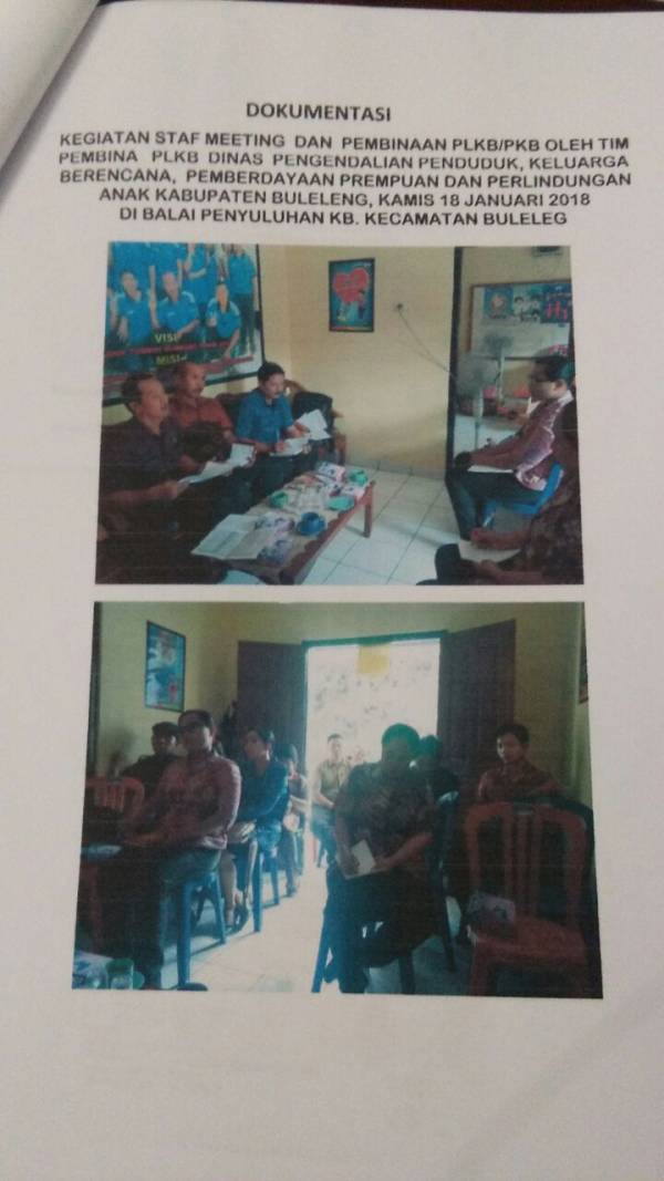 Kamis, 18 Januari 2018, Dinas Pengendalian Penduduk Keluarga Berencana, Pemberdayaan Perempuan dan Perlindungan Anak Kabupaten Buleleng mengadakan staf meeting dan pembinaan PLKB/PKB oleh tim Pembinaan PLKB di balai Penyuluh Kecamatan Buleleng