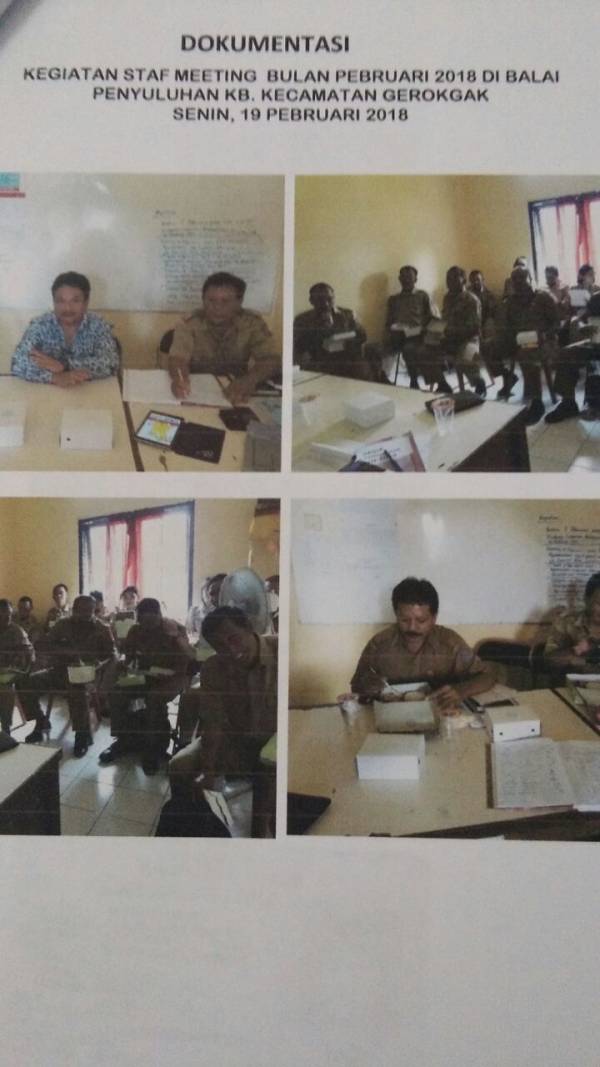 Senin, 19 Pebruari 2018, Dinas Pengendalian Penduduk Keluarga Berencana, Pemberdayaan Perempuan dan Perlindungan Anak Kabupaten Buleleng mengadakan staf meeting dan pembinaan PLKB/PKB oleh tim Pembinaan PLKB di balai Penyuluh Kecamatan Gerokgak
