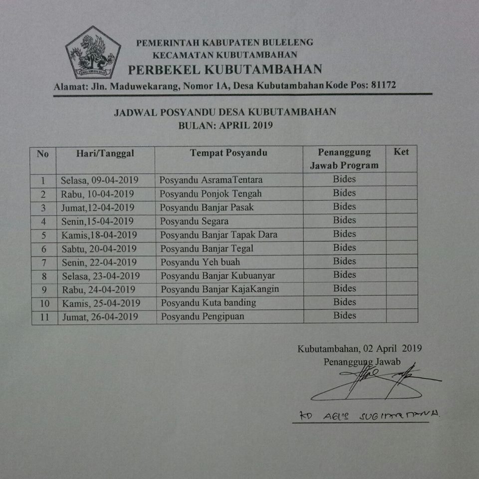 JADWAL POSYANDU DESA KUBUTAMBAHAN BULAN APRIL 2019