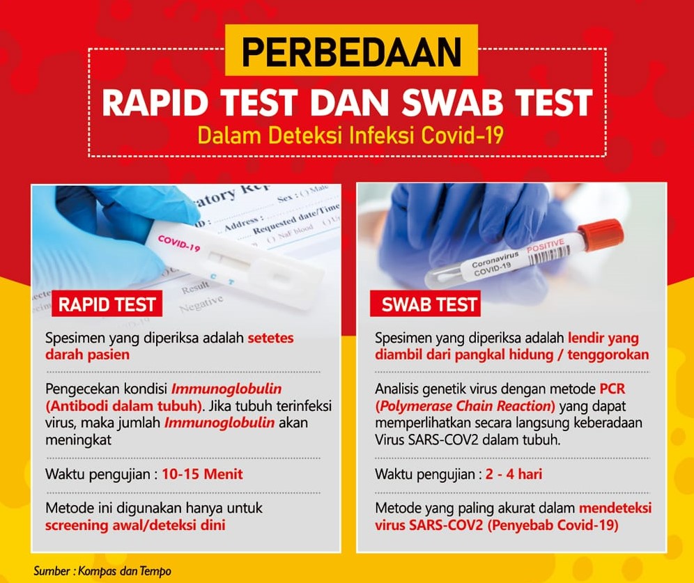 Sebagai upaya untuk menekan penyebaran virus Corona, pemerintah sudah mulai melakukan rapid test dan swab test di beberapa wilayah di Indonesia, khususnya di beberapa wilayah di Indonesia yang memiliki kasus COVID-19 yang tinggi. Tes ini ditujukan agar pemerintah dan petugas kesehatan bisa mengetahui siapa saja orang yang berpotensi menyebarkan virus Corona dan melakukan tindakan pencegahan agar jumlah kasus COVID-19 tidak semakin bertambah.